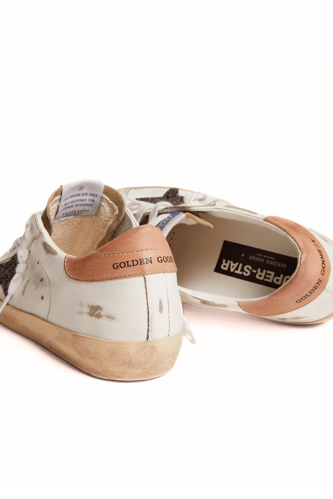 O piesă clasică a brandului Golden Goose, reinterpretată cu accente glam și detalii subtile: Super-Star-ul pentru femei combină partea superioară din piele albă cu o stea laterală glitter neagră și o călcâie din piele veche-roz, oferind un look sofisticat, dar relaxat. Efectul vintage și contrastul delicat de tonuri adaugă personalitate fiecărei ținute.