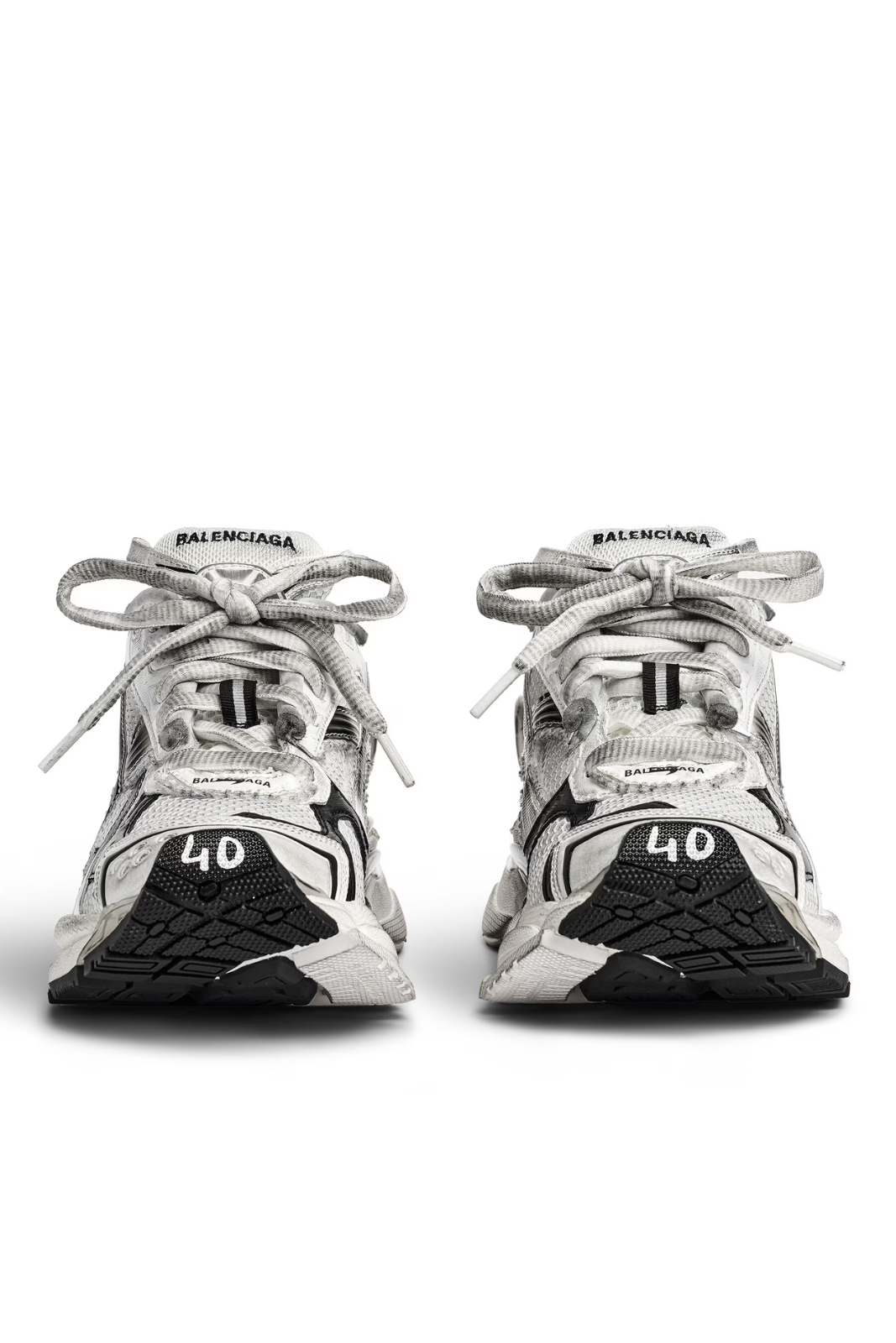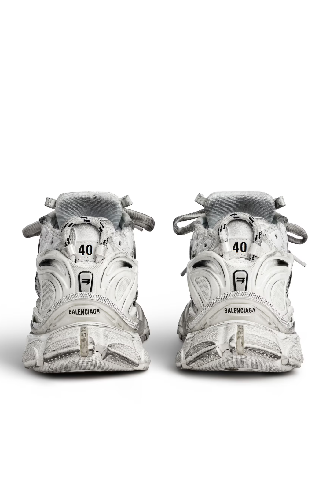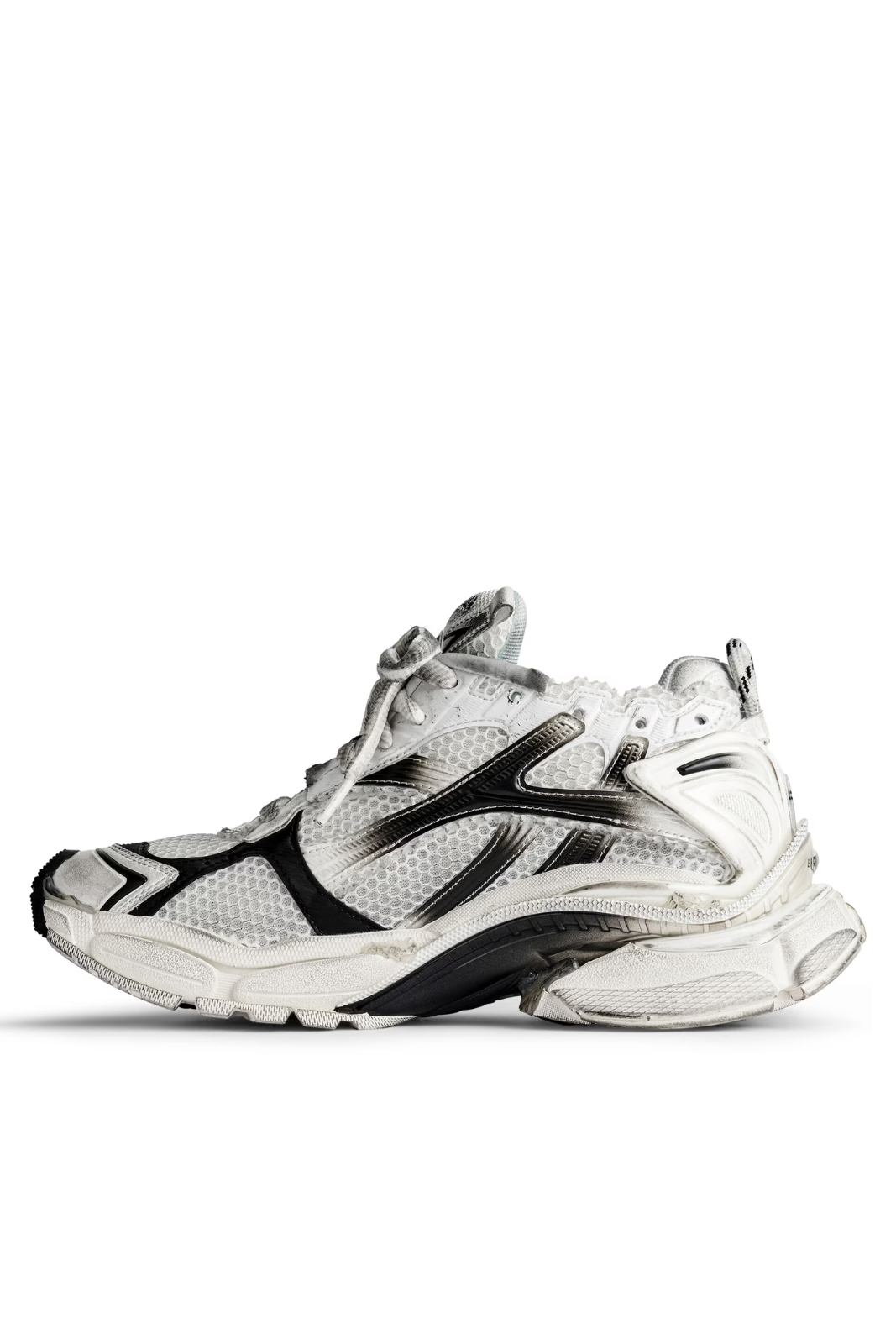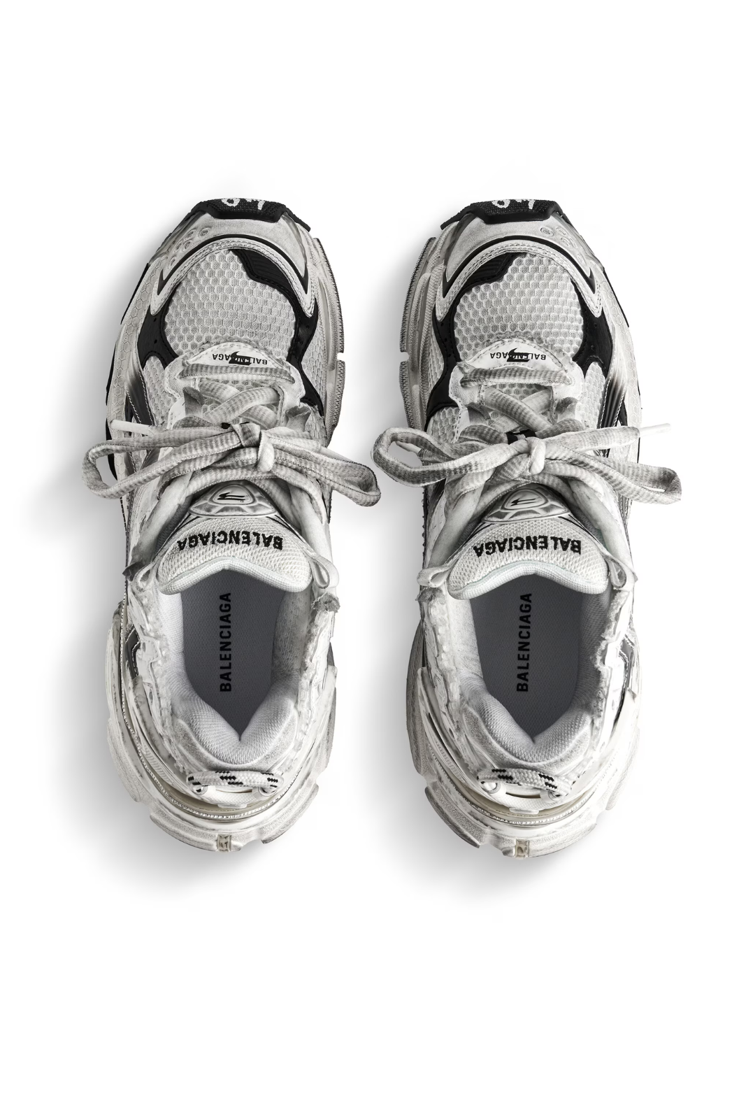 Această versiune prezintă un efect gradient alb-negru și este tratată manual pentru a obține un aspect worn-out autentic. Modelul include detalii de branding specifice Balenciaga: mărimea imprimată la vârf, mărimea embosată pe spate, logo-ul Runner imprimat pe lateral, precum și logo-ul Balenciaga brodat pe limbă și inscripționat pe călcâi. Banda de tragere la spate adaugă un plus de funcționalitate.