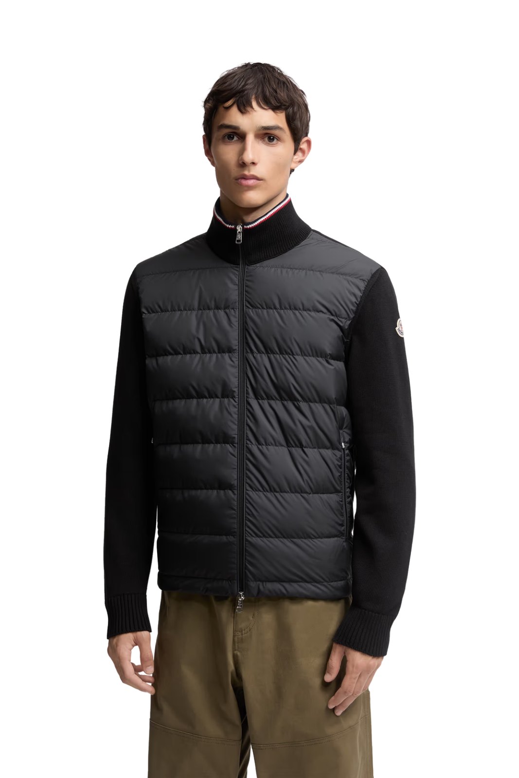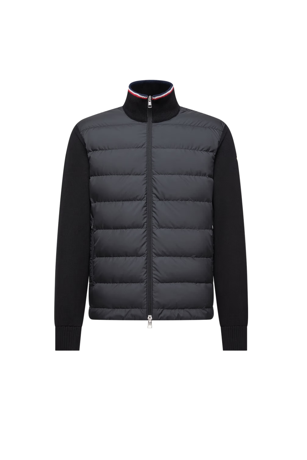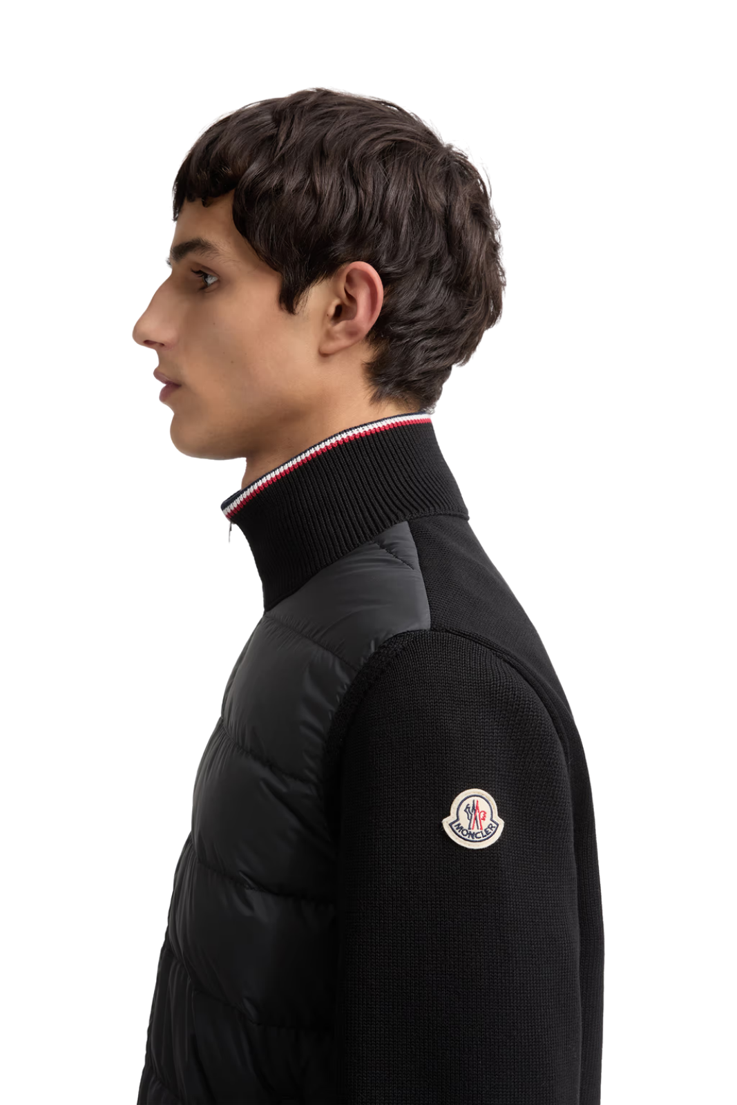 MATERIALE: Partea frontală matlasată cu umplutură din puf pentru izolație termică. Corp și mâneci din bumbac moale, cu textură confortabilă. Logo Moncler aplicat pe braț. Garnitură tricoloră emblematică pe guler pentru un plus de identitate vizuală.