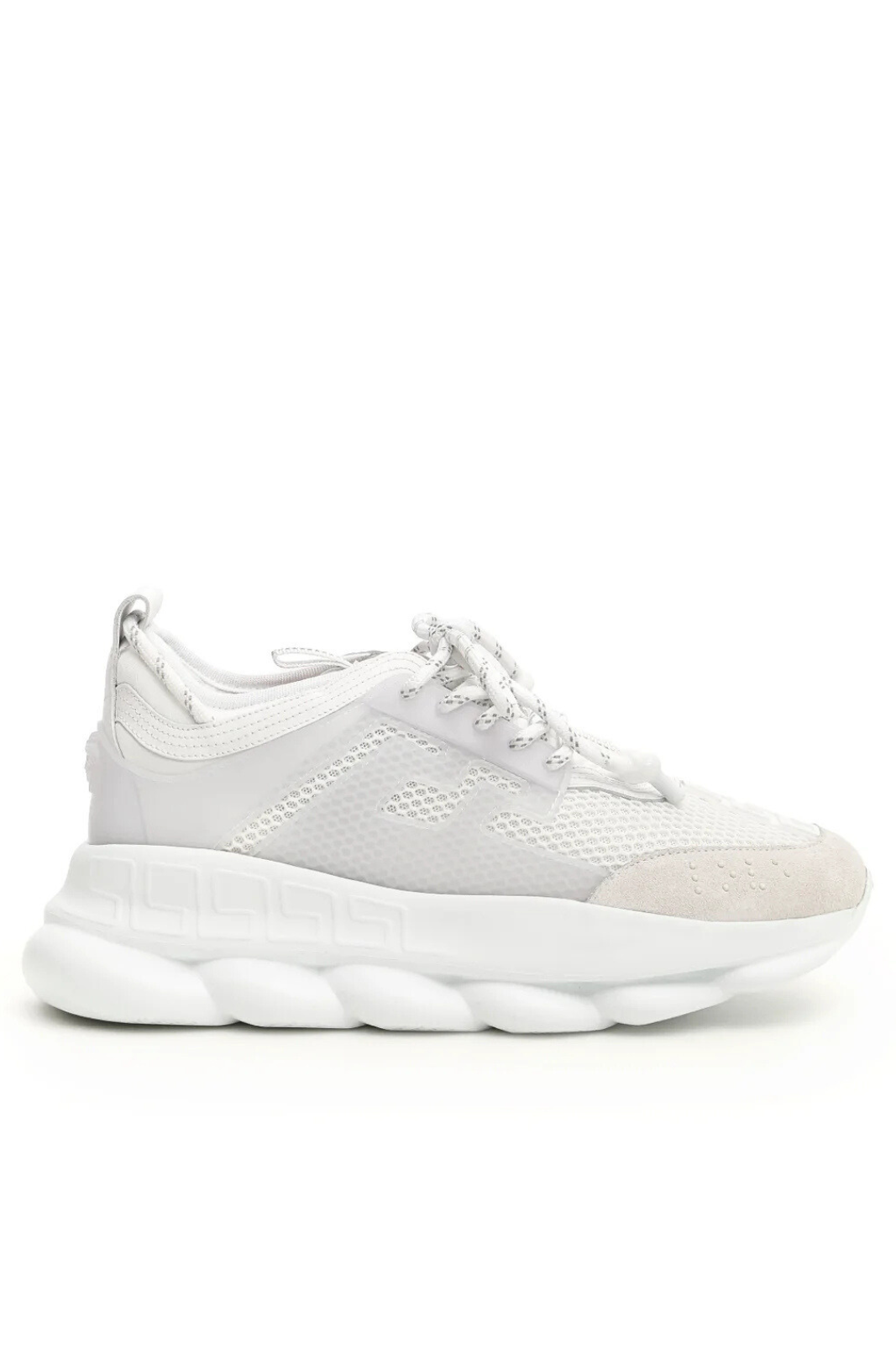 Sneakersii Versace Chain Reaction sunt o pereche iconică, caracterizată printr-un design avangardist și detalii inovatoare. Cu talpa robustă și emblematica textură în lanț, acești sneakers oferă un mix perfect între confort, stil și un look modern. Ideali pentru cei care caută o piesă statement în garderoba lor, acești sneakersi combină elemente de lux cu o estetică urbană.