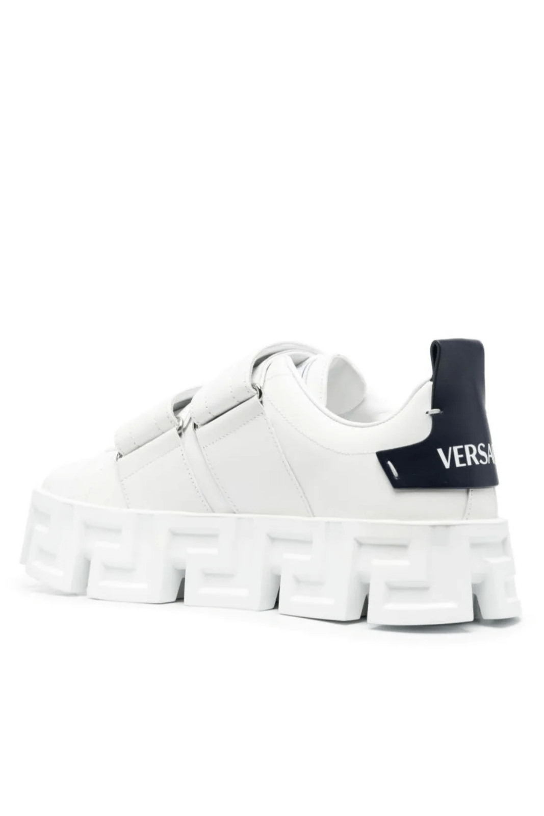 Pantofii sport Greca Labyrinth de la Versace îmbină eleganța clasică cu un design modern, oferind un aspect sofisticat și inovator. Acești sneakersi albi sunt ideali pentru a adăuga un strop de stil ținutelor tale, fiind perfecti pentru ocazii casual sau pentru a îmbunătăți o ținută mai elegantă.