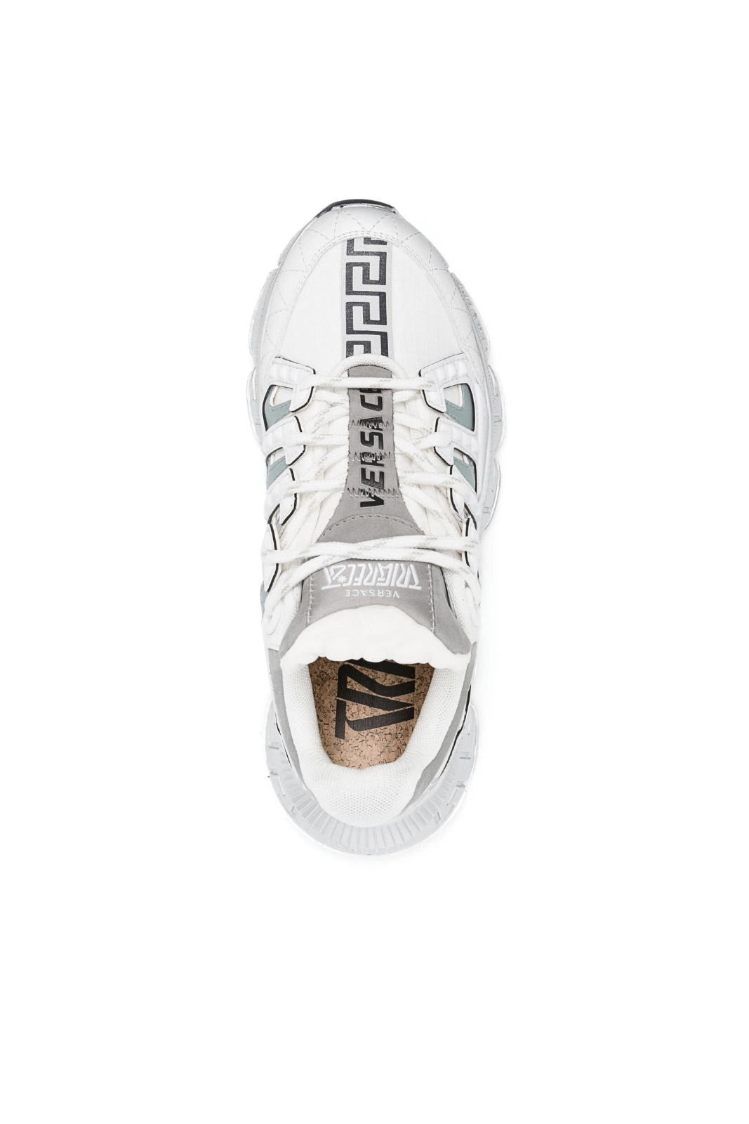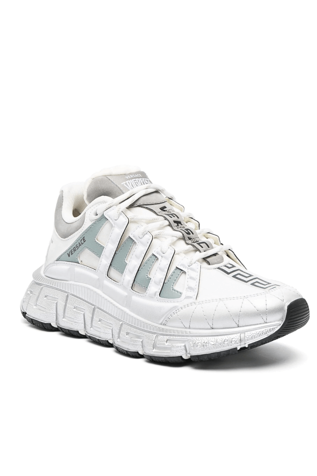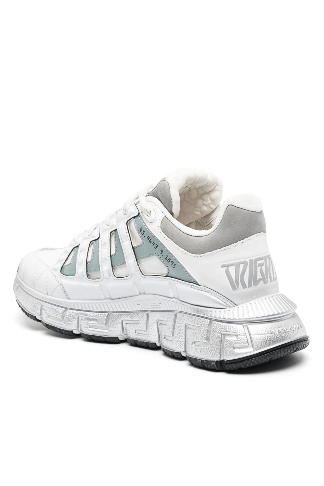 Abordarea inovatoare a încălțămintei Versace este evidentă în pantofii sport Trigreca. Această pereche dispune de sistemul de amortizare Greca, cu banda de rulare Greca dedesubt. Casa aduce un omagiu rădăcinilor sale milaneze cu coordonatele orașului imprimate pe partea superioară.